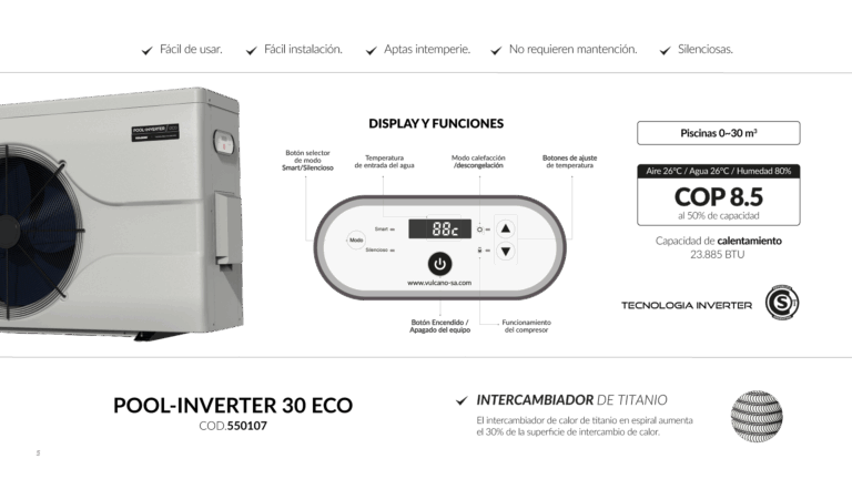Está equipada con un intercambiador de calor de titanio espiralado, que mejora en un 30% la transferencia térmica, y cuenta con modos de funcionamiento Smart y Silencioso para adaptarse al uso diario. Incluye sistema de descongelamiento automático.