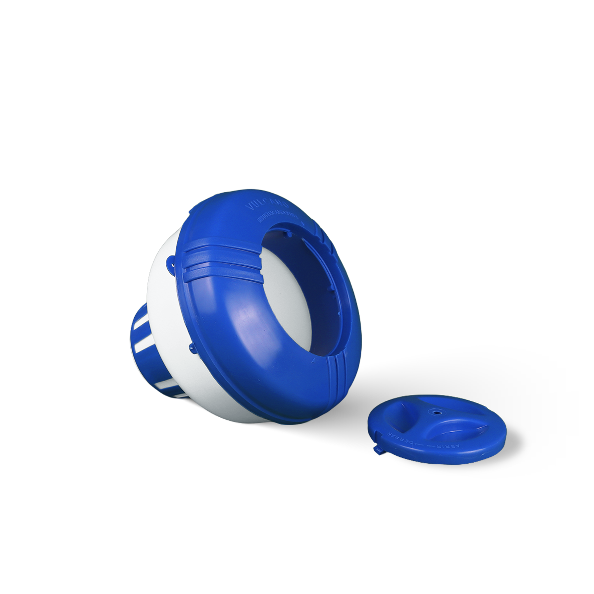 Boya dosificadora de cloro Vulcano modelo Exo, para pastillas de 50 y 200 g, con ojal para limitar su movilidad dentro del espejo de agua. La boya dosificadora flota sobre la superficie de la piscina conteniendo pastillas de cloro de disolución lenta o triple acción que, al al entrar en contacto con el agua, se disuelven lentamente.