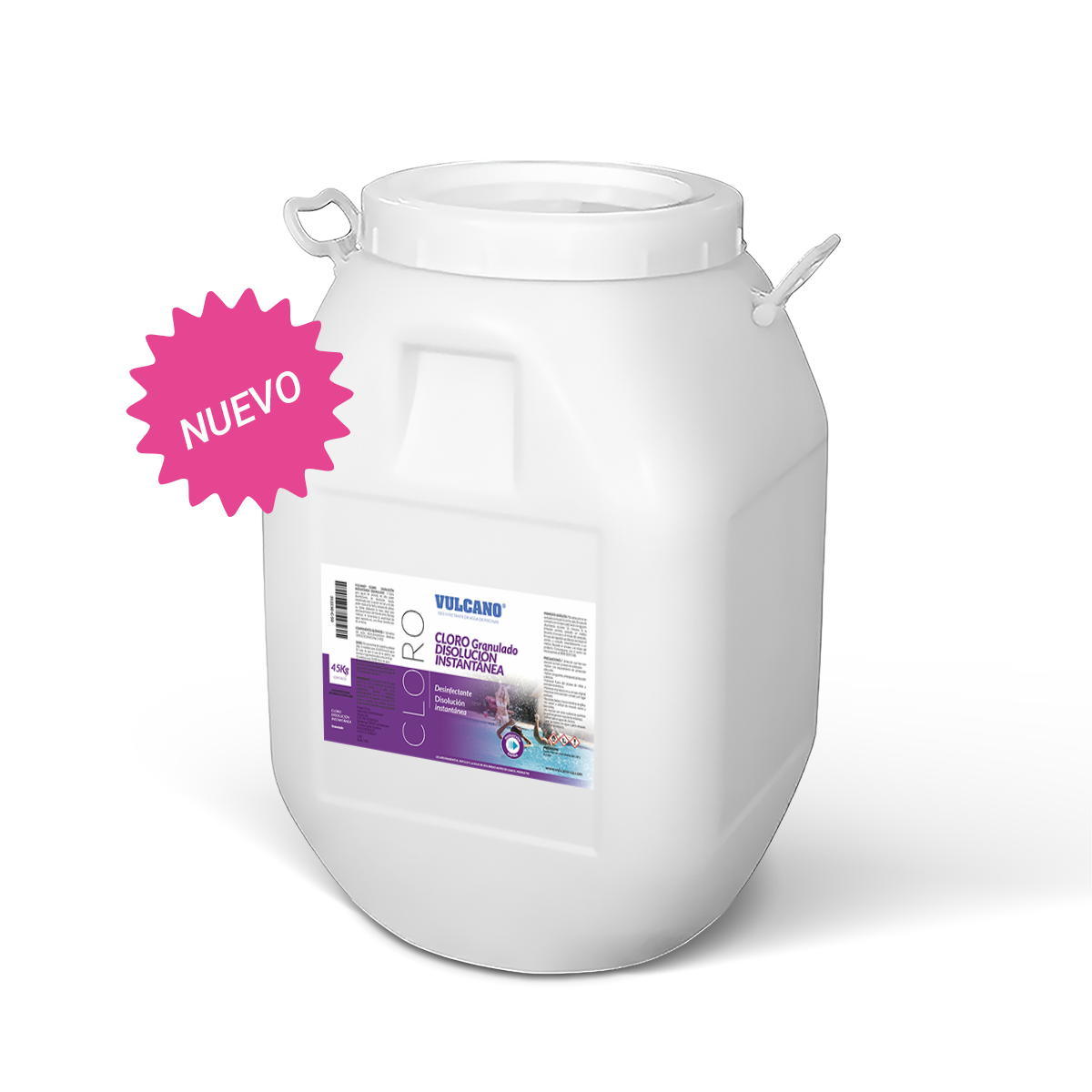 Cloro granulado Vulcano - Disolución instantánea 45 kg. Eficaz bactericida de disolución instantánea con alto poder desinfectante, apto para todo tipo de piscinas con 56% de cloro activo. No incrementa la alcalinidad del agua, se mantiene estable ante la acción del sol y es de alto poder residual.