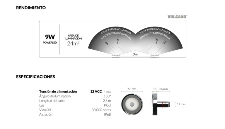 La luminaria LED subacuática PowerLED RGB 9W Vulcano con cable de 2,6 m es una solución eficiente y decorativa para la iluminación de piscinas, combinando bajo consumo energético con una excelente potencia lumínica.